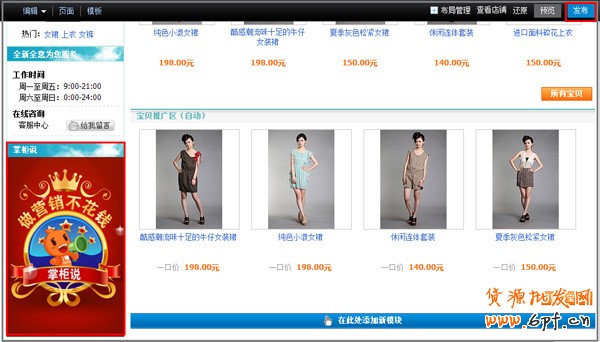 返回裝修頁面,便能看到店鋪內已經添加“掌柜說”模塊,如下圖所示,但一定要點擊右上角的“發布”按鈕才算真正添加完畢哦~~~~