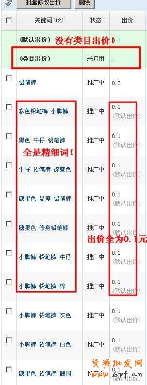 大家看下面這個例子:存在很多問題。第一,類目出價未啟用;第二,關鍵詞出價全部都是0.1;第三,關鍵詞太少;第四,關鍵詞都過于精準。