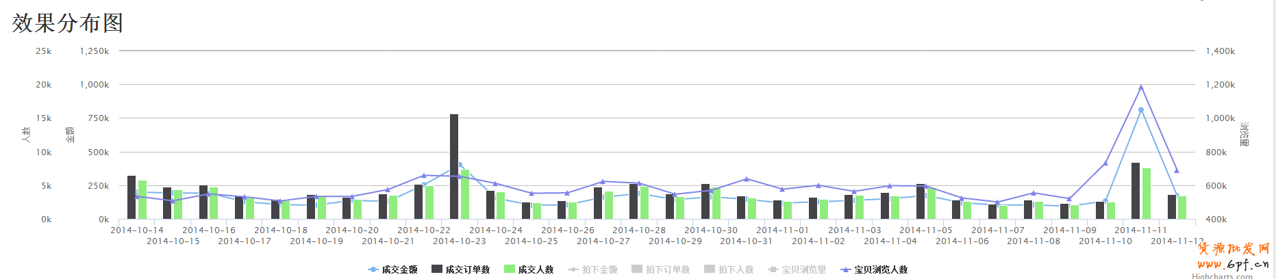 這是最近的一些效果分布圖,可以看到成交金額、成交訂單數、成交人數都是穩步增長,到雙十一這天達到頂峰。