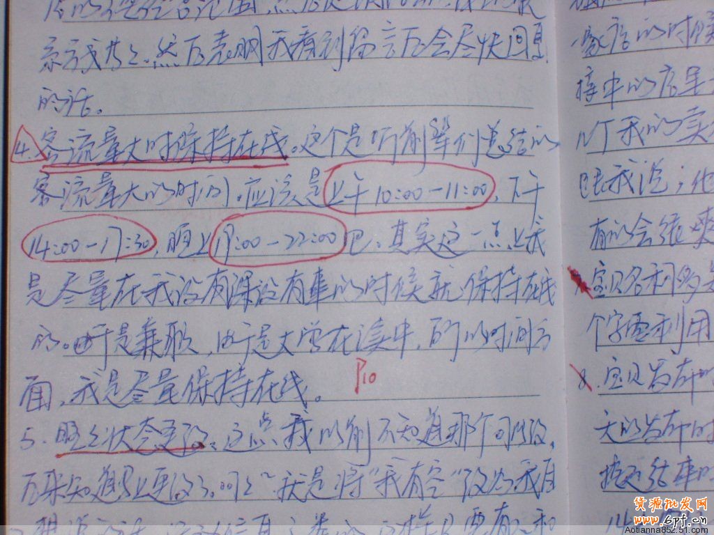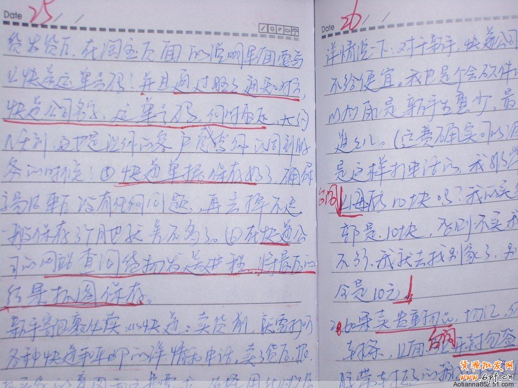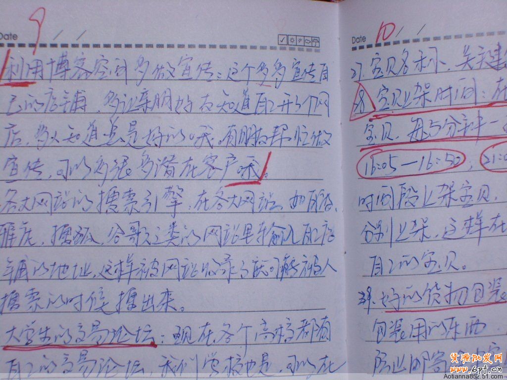 我深知,在開(kāi)店初期不易著急做買賣掙錢,有得甚至賠錢呢。所以要多在社區(qū)里學(xué)習(xí),學(xué)習(xí),再學(xué)習(xí)。把重要的內(nèi)容記錄在專用筆記本上,用紅筆畫(huà)出內(nèi)容關(guān)鍵詞,以后想回頭復(fù)習(xí),也是非常省心的。這樣,抄一遍,腦子里就多了一點(diǎn)印象,而且要“溫故而思新”哦! 現(xiàn)在,我將本人筆記本里的內(nèi)容,用數(shù)碼相機(jī)拍下來(lái)。本來(lái)想用自己在社區(qū)里所學(xué)到的圖片處理技巧,讓照片更完美一些,還請(qǐng)各位多多諒解本人的忙碌~~ 我把圖片一一上傳,供各位參考。圖片隆重登場(chǎng),大家鼓掌歡迎
