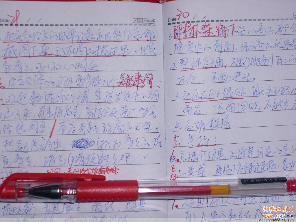 。我還是買了紅色的筆,標(biāo)出每個(gè)編號(hào)下的內(nèi)容關(guān)鍵詞。下面我給舉個(gè)例子,比如抄寫完“怎樣利用簽名檔推廣自己寶貝”的帖子后,用紅筆把“簽名檔”三個(gè)字下劃上一道紅線;再如“客流量最大時(shí)候保持在線”的帖子,在“客流量”三個(gè)字下標(biāo)上紅線,然后把所說(shuō)的時(shí)間用圈圈圈起來(lái)。這樣,大家明白了吧