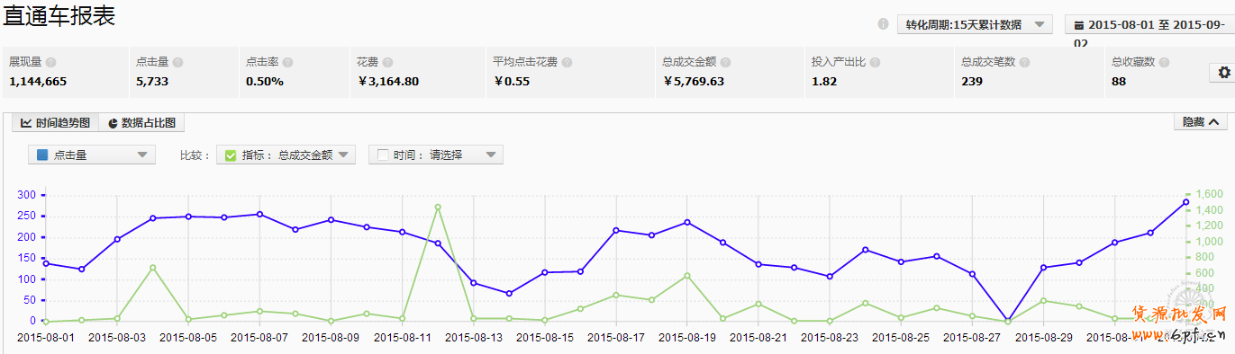 我們可以得知,在這個時間段,直通車總體點擊量每天也就兩百多個,平均點擊花費五毛多,流量和PPC比較平穩,點擊率后期略有上漲,也就到0.72,但ROI成交起伏非常大,總體投入和產出成交比較低,總體數據比較低。因該店鋪屬于小類目,店鋪同類寶貝非常多,寶貝內部競爭也較強,所以寶貝本身類目流量有限,如何減輕寶貝間相互競爭和爭取行業有限流量就成為了當前難題。