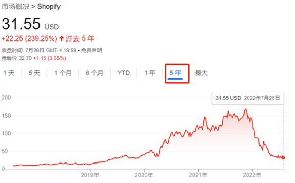 一系列的不利影響,導(dǎo)致Shopify業(yè)績(jī)大受影響,股價(jià)也大幅度下跌,由2021年11月的175美元峰值,跌到現(xiàn)在的30多美元,跌去了80%。